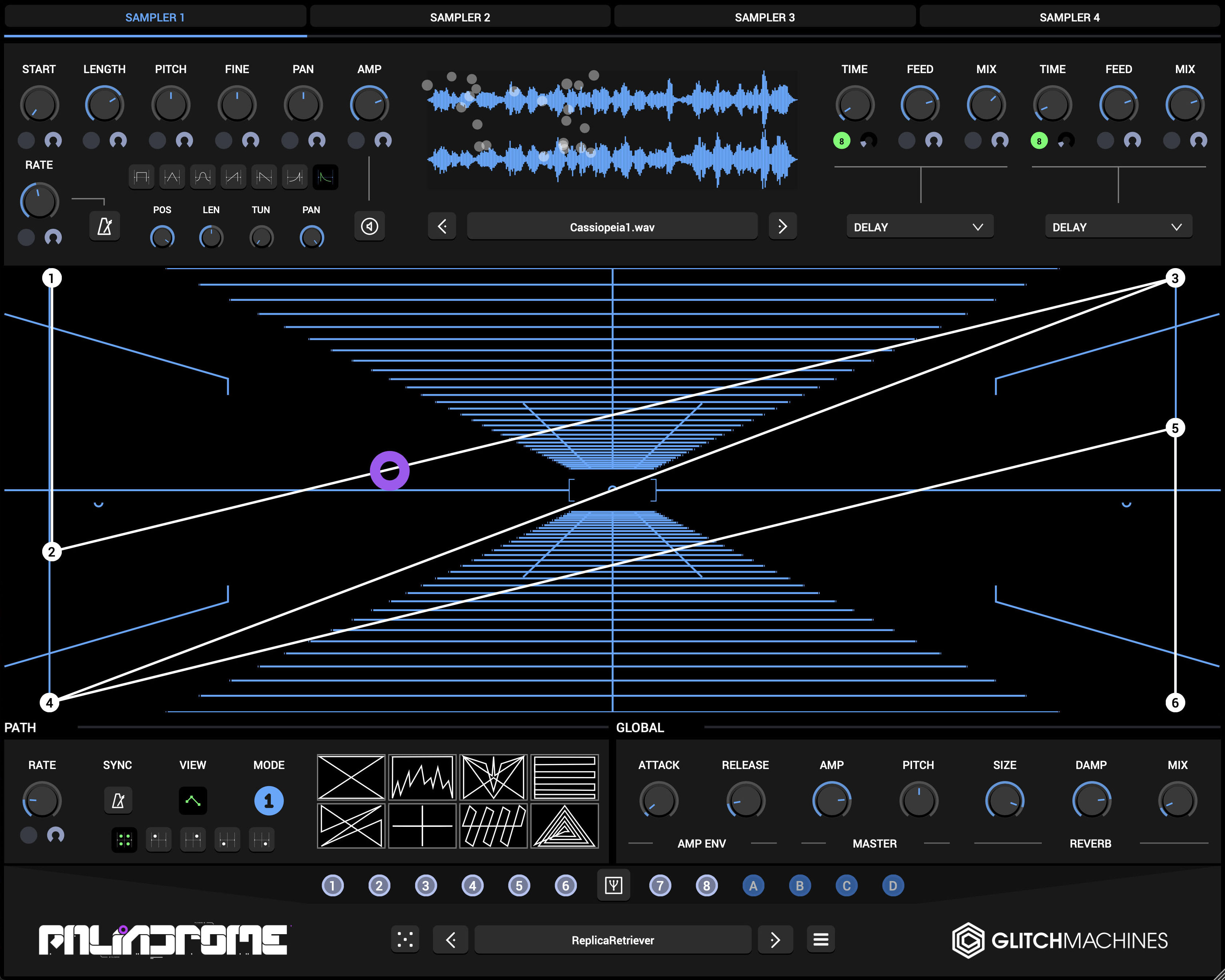 The basic concept behind Palindrome is to fuse four granular samplers with a coordinate plotting grid and complex modulation sources in order to facilitate the creation of morphing sound effects and unusual instrument patches.